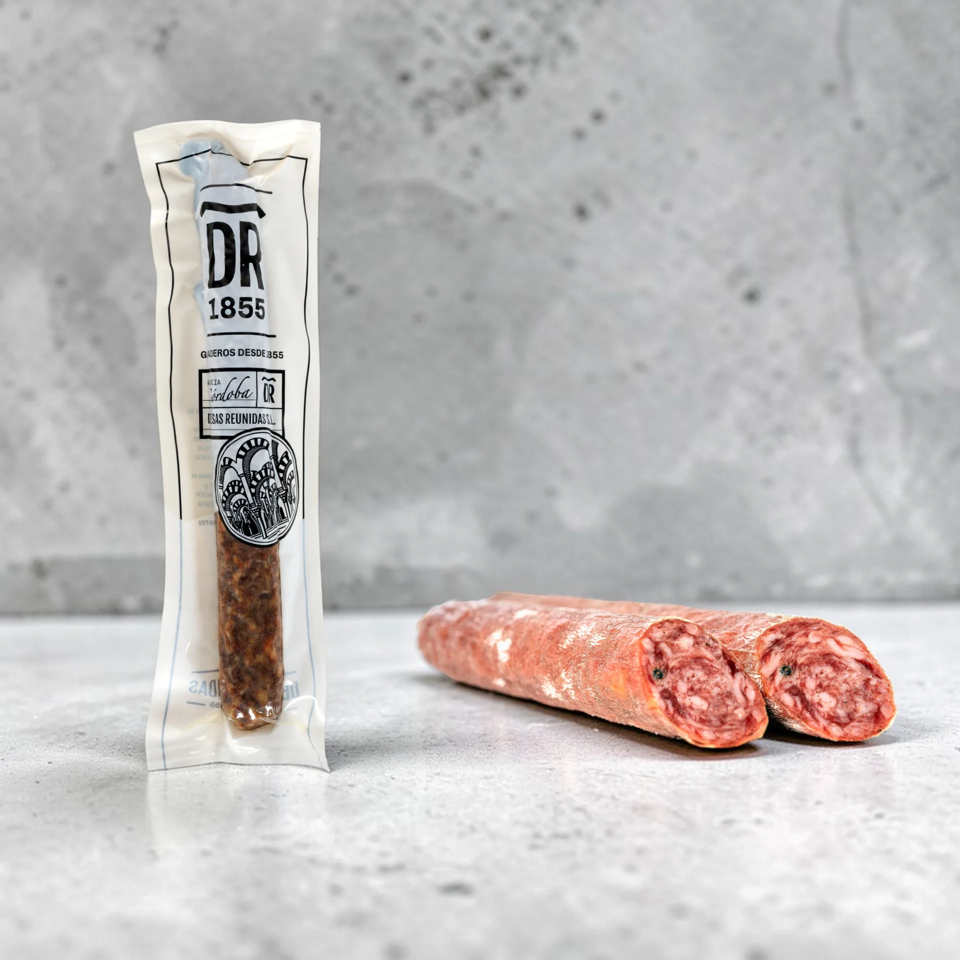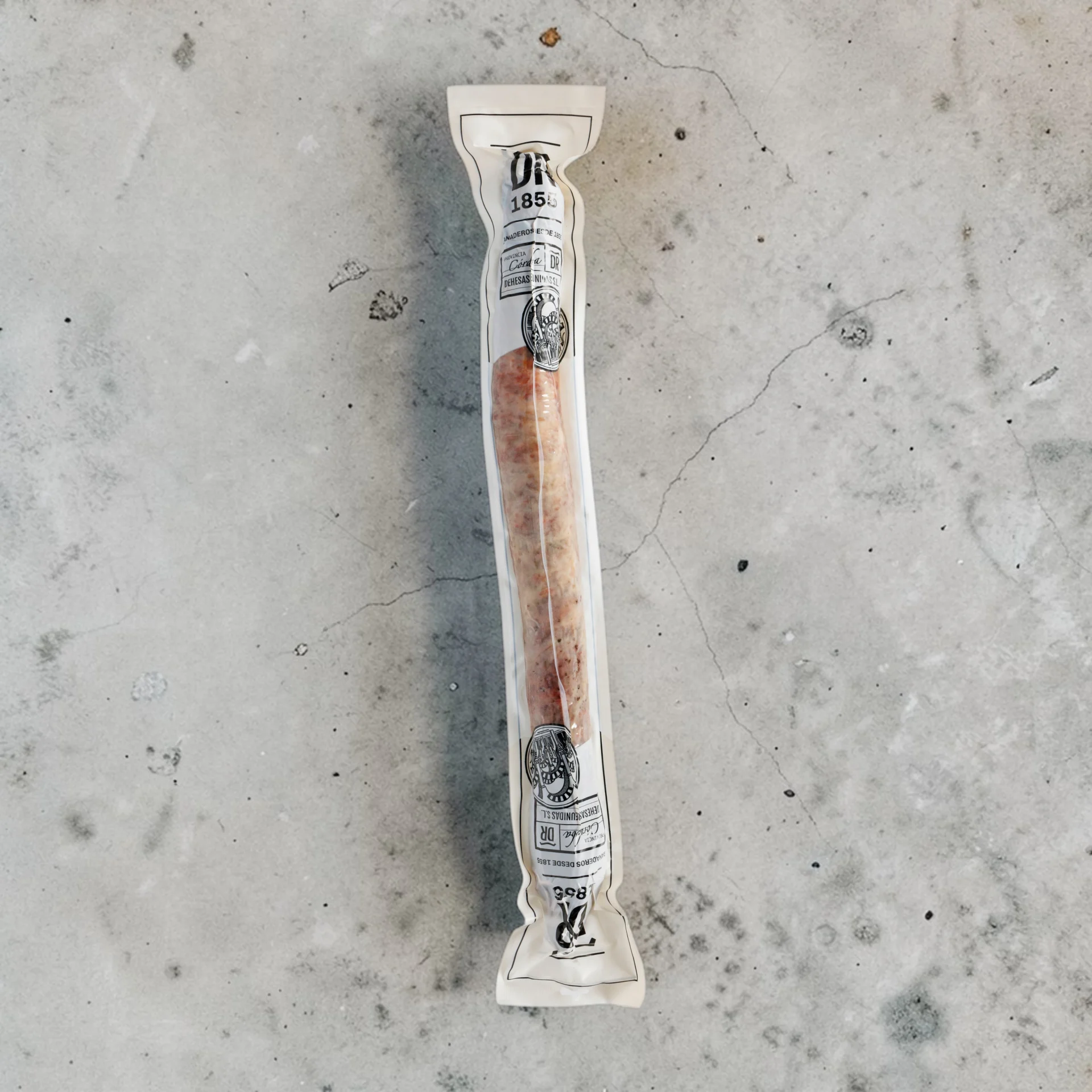 En DR1855, el salchichón es sinónimo de distinción. Seleccionamos las carnes más magras y nobles de nuestros cerdos 100% ibéricos de bellota para crear una pieza donde la grasa infiltrada, rica en ácido oleico, es la verdadera protagonista. El secreto de su receta reside en un adobo suave y equilibrado: una selección de especias naturales y pimienta negra que realza el sabor de la montanera sin restarle protagonismo a la pureza racial.